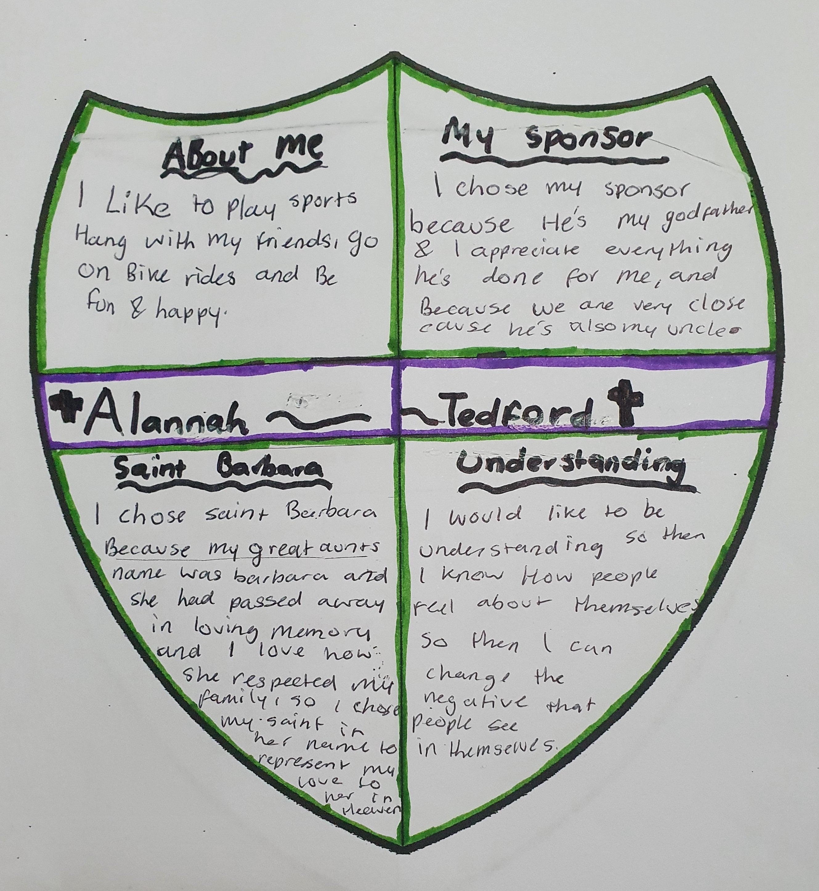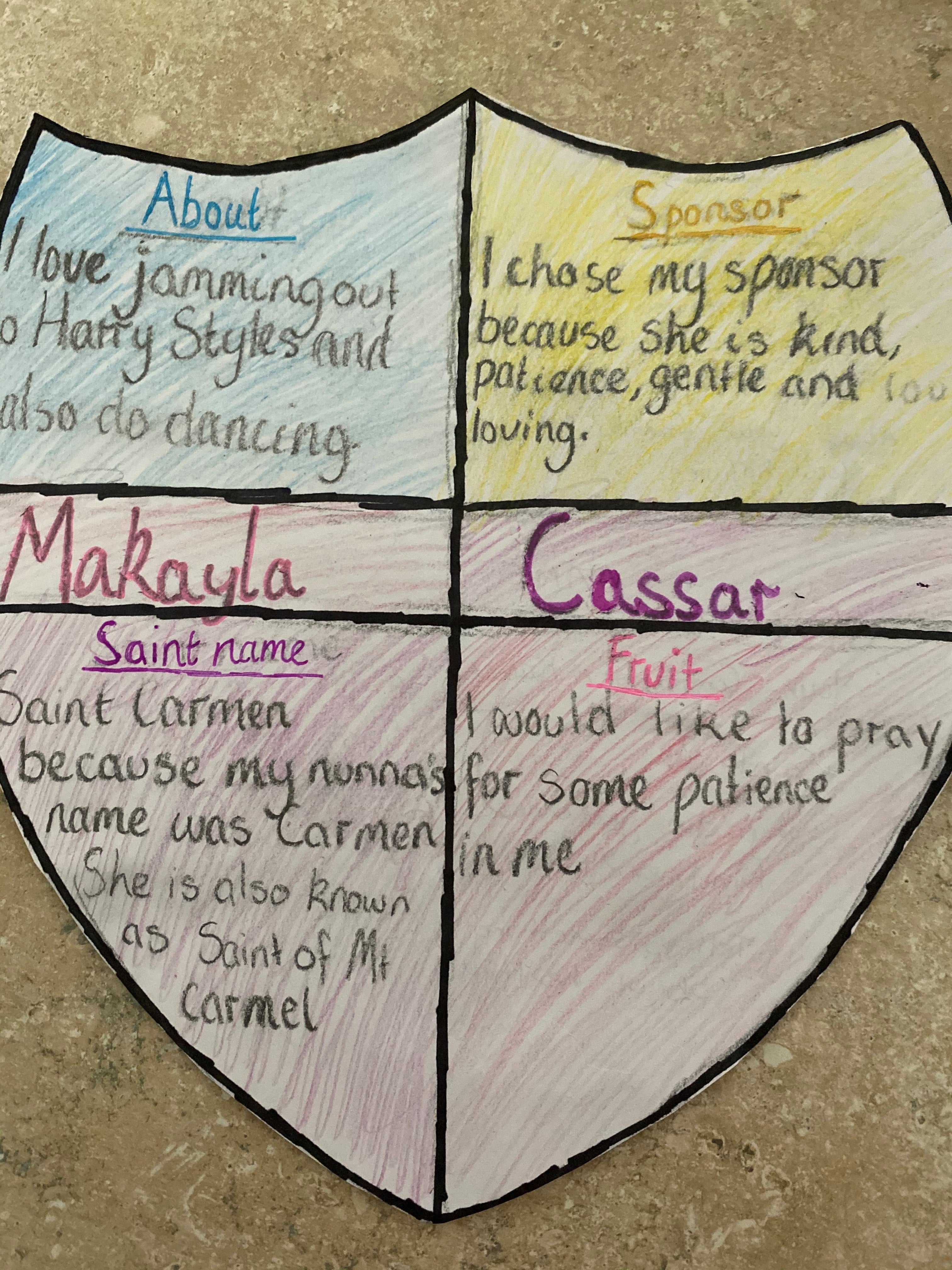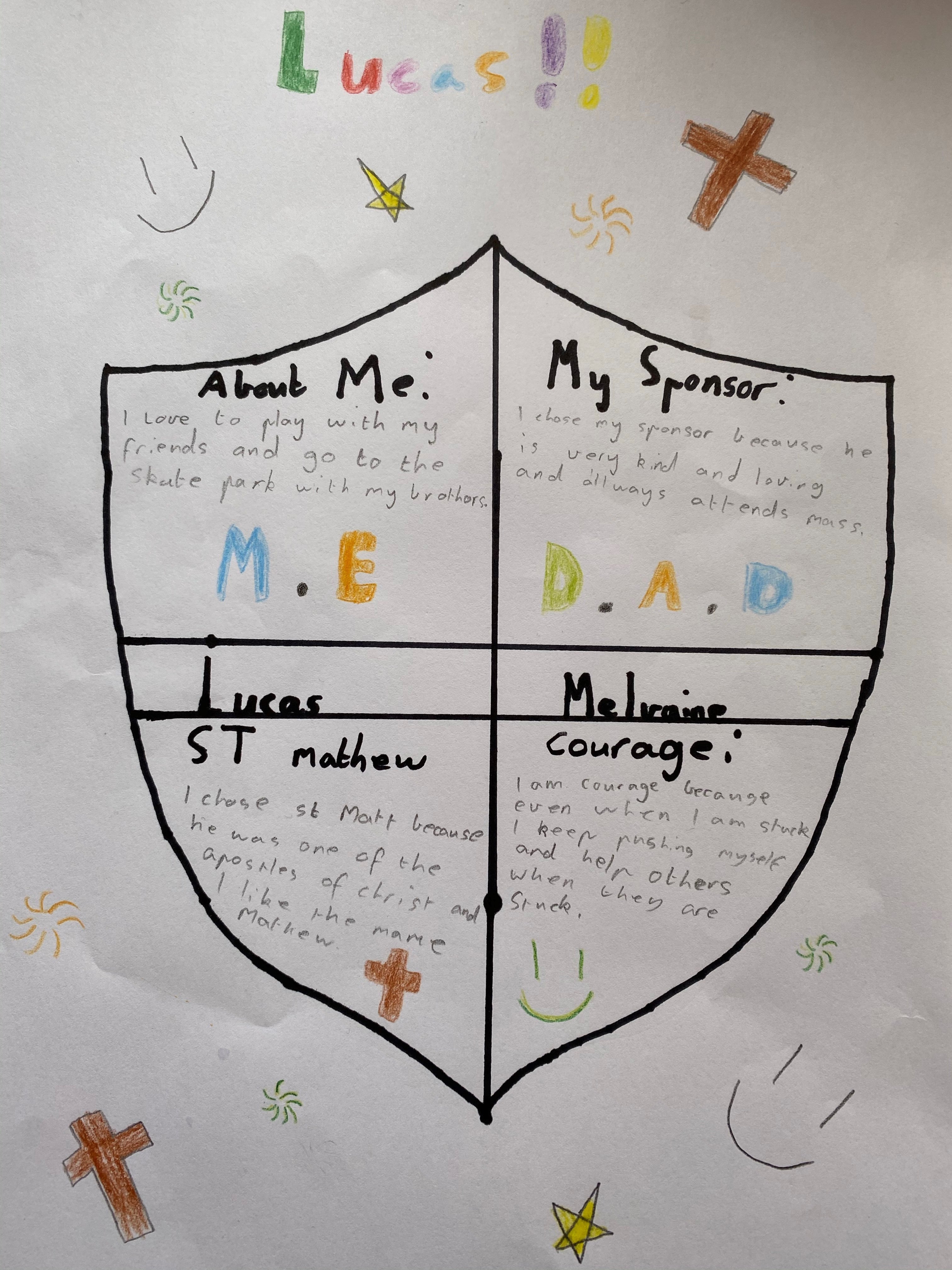 The children in the Parish Sacramental Preparation Program continue to learn and develop their awareness of God’s Holy Spirit in the world and each other. We continue to gather via ZOOM to stay connected and encouraged at this time of lockdowns and restrictions until such a time when we as community, join with them in celebrating their Sacrament of Confirmation. Currently, they are working on a shield that reflects how they see God’s Spirit in themselves and their actions, their Sponsor, and in their chosen Saint. We're happy to share some of the incredible and inspiring work from our children below: