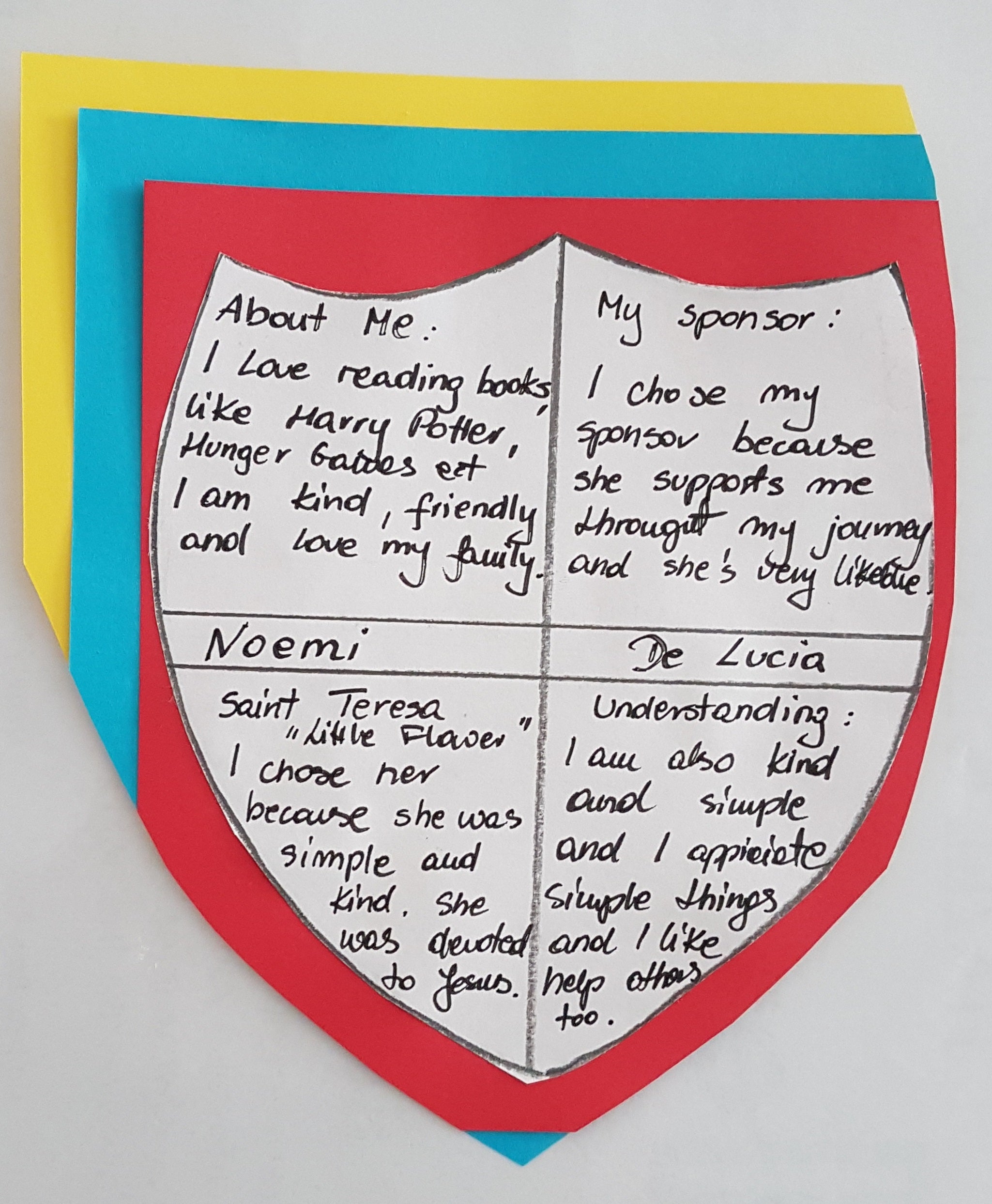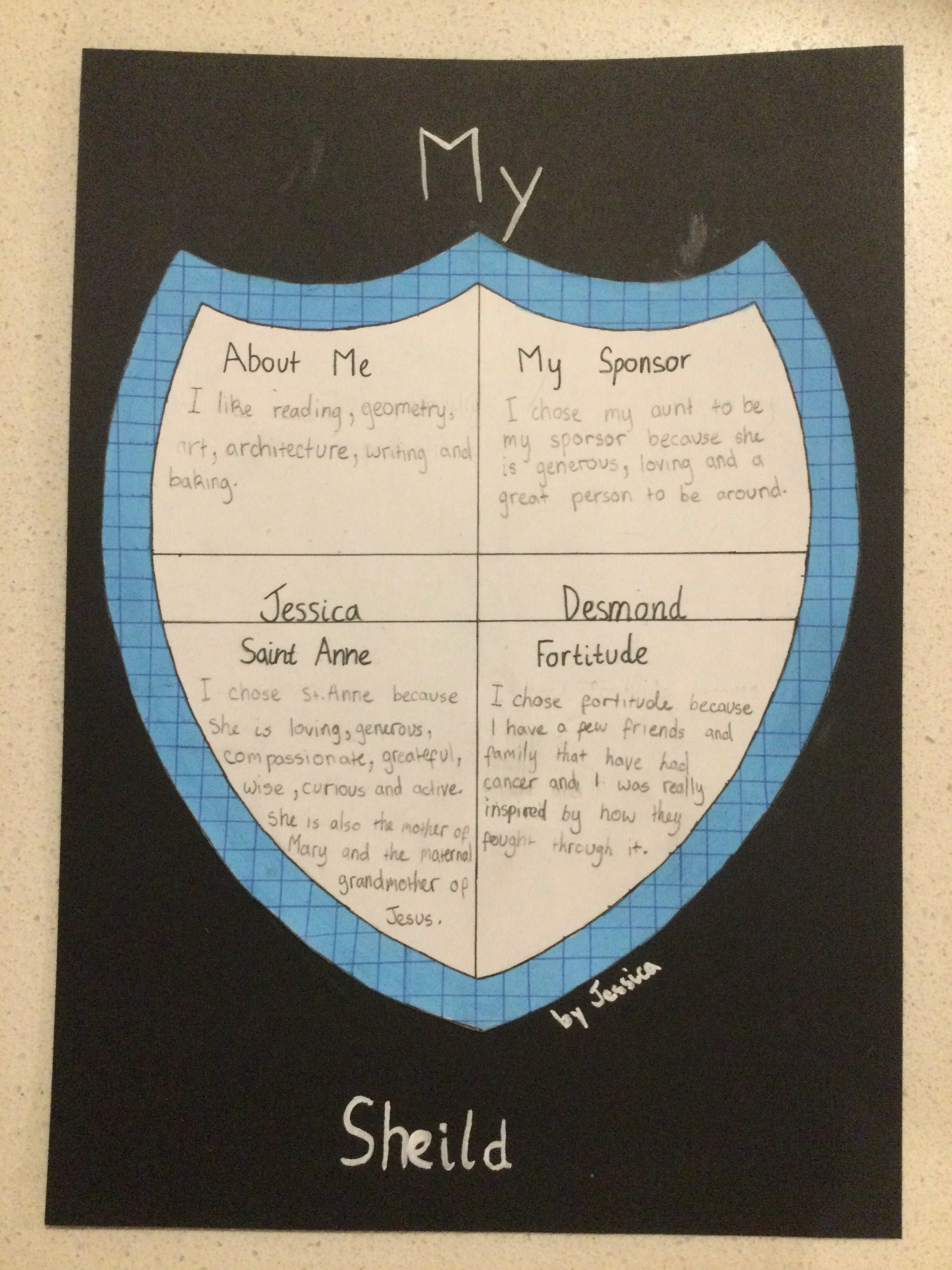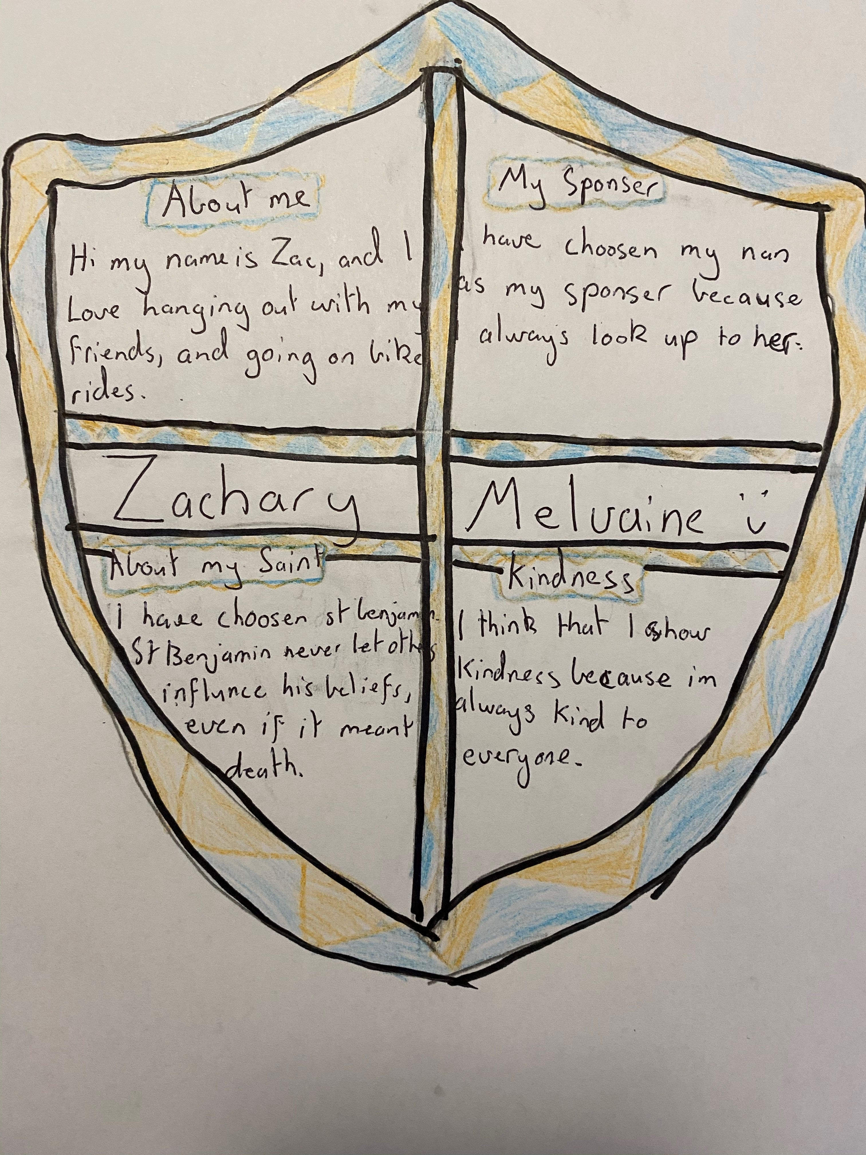 The children in the Parish Sacramental Preparation Program continue to learn and develop their awareness of God’s Holy Spirit in the world and each other. We continue to gather via ZOOM to stay connected and encouraged at this time of lockdowns and restrictions until such a time when we as community, join with them in celebrating their Sacrament of Confirmation. Currently, they are working on a shield that reflects how they see God’s Spirit in themselves and their actions, their Sponsor, and in their chosen Saint. We're happy to share some of the incredible and inspiring work from our children below:
